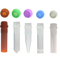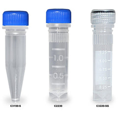 Microcentrifuge tubes vary in material (glass or plastic), cap style (snap cap or screw thread), and certification type.