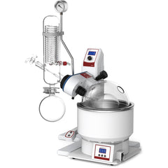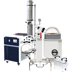 Standard Glassware Set includes 5.28 gallon (20 liters) round-bottomed evaporating flask, 2.64 gallon (10 liters) round-bottomed receiving flask, and vertical condenser. Rotary evaporators with vertical glass condenser are great for distillation of solvents with higher boiling points.