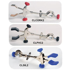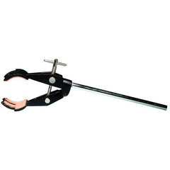 This non-corrosive separatory funnel holder, molded in polypropylene, has a front opening which provides clear view of the solution and allows unobstructed placement of separating funnels. Two tapered wedges are provided to ensure firm grip on rods measuring 1/2" or 3/8" diameter.